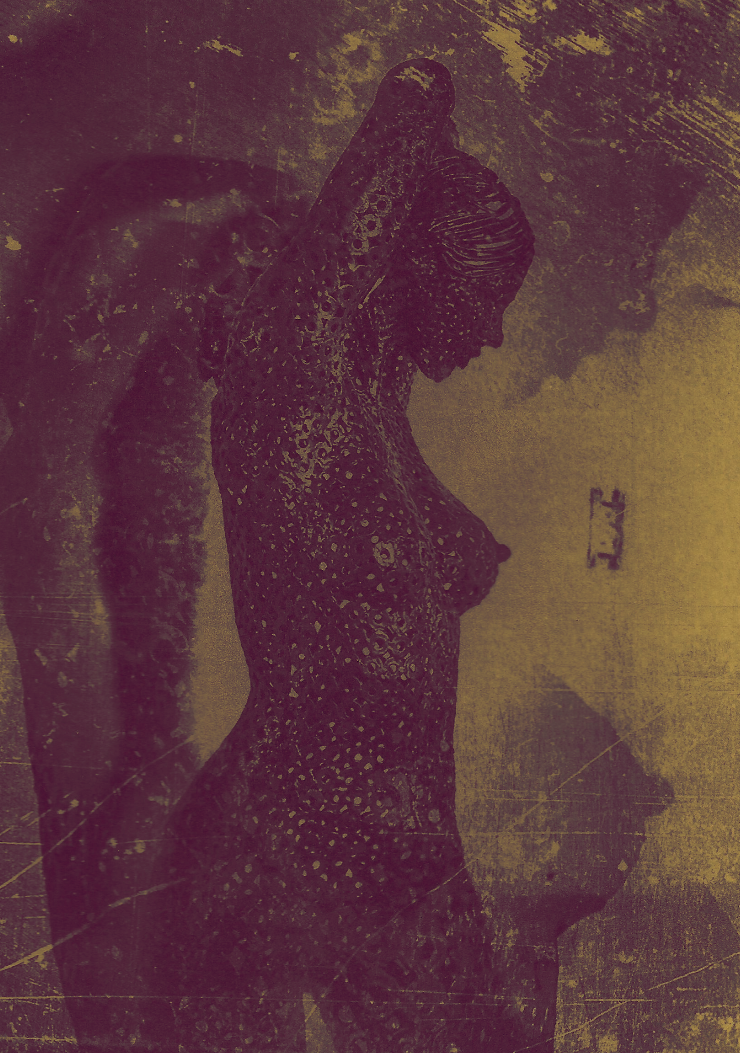 Las imágenes que conforman la instalación parten de esculturas de metal, figuras femeninas construidas a partir de arandelas de hierro. Cuerpos no macizos, formados por repetición y vacío, que ya contienen en su origen una tensión entre resistencia y fragilidad. Mi trabajo comienza al apropiarme de estas esculturas como punto de partida, no desde la cita ni el homenaje, sino desde la traducción: trasladarlas de la tridimensionalidad al plano fotográfico, del objeto industrial al cuerpo sensible.